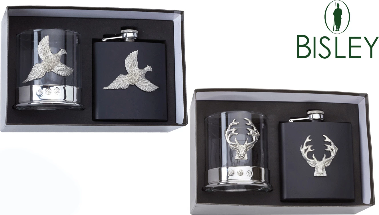 The Bisley Whisky Glass and Flask Gift Set includes high-quality and heavyweight whisky glass, complete with fine English pewter band, and matching hip flask in black stainless steel. Choose Pheasant or Stag design.