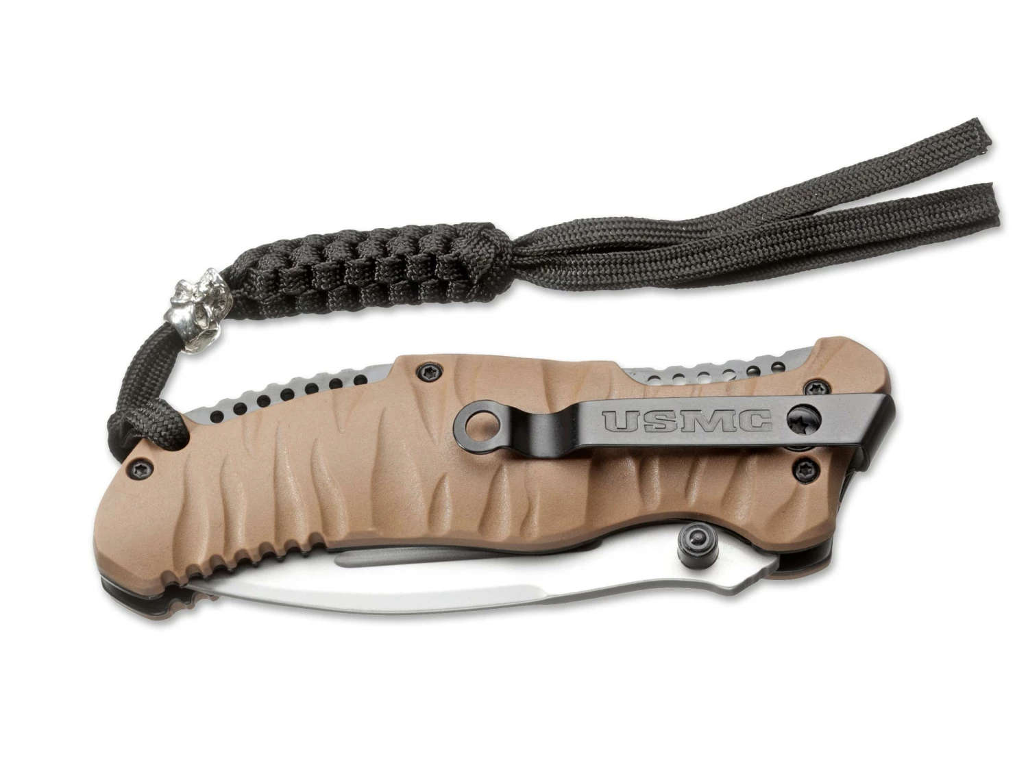This imposing one-handed knife impresses with its impactful presence. The partially serrated 440C stainless steel blade has a spring-assisted flipper deployment mechanism. The pleasantly contoured and textured, desert-colored plastic handle displays the US Marines emblem. The blade is engaged by a liner lock mechanism. Includes clip and lanyard with metal skull.
