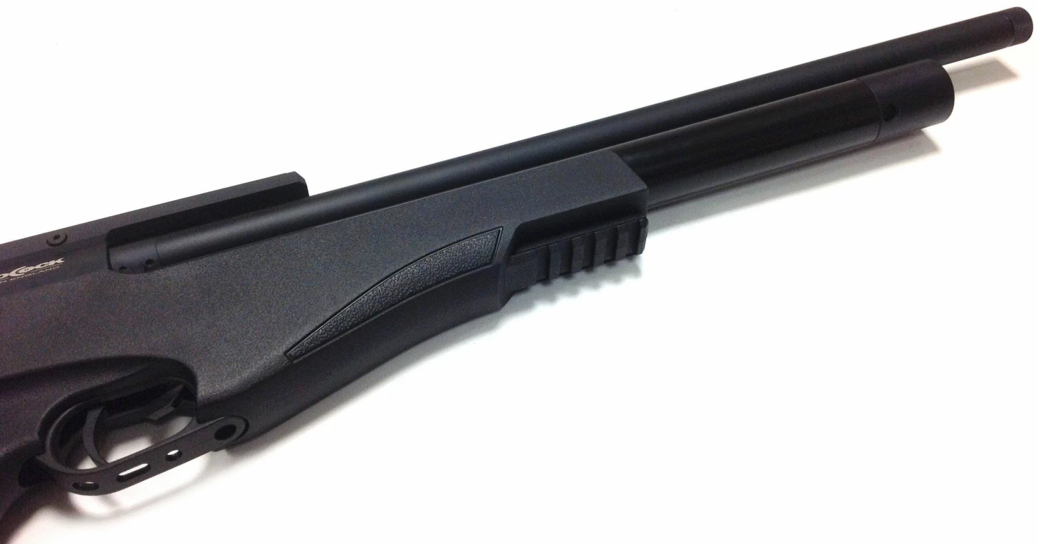 The Borock Compatto MKII is a Semi Bull Pup style air rifle with skeleton synthetic stock, shrouded barrel with baffles, 1/2″ UNF silencer thread, 5 level power adjustment, and 150cc air cylinder. The 10 round magazine self indexes whilst cocking the rifle and the Compatto uses a slingshot hammer system similar to Daystate airguns. The safety catch is a left/right blade located in front of the adjustable two-stage trigger.