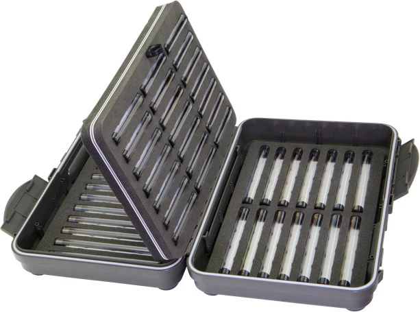 The ultimate tube fly storage box. The box features eight non-slip rubber feet to prevent the box from sliding on wet surfaces. Inside the box there is a movable flip that holds its position. The box comes with 59 clear tubes which keep your flies dry and keeps their shape.