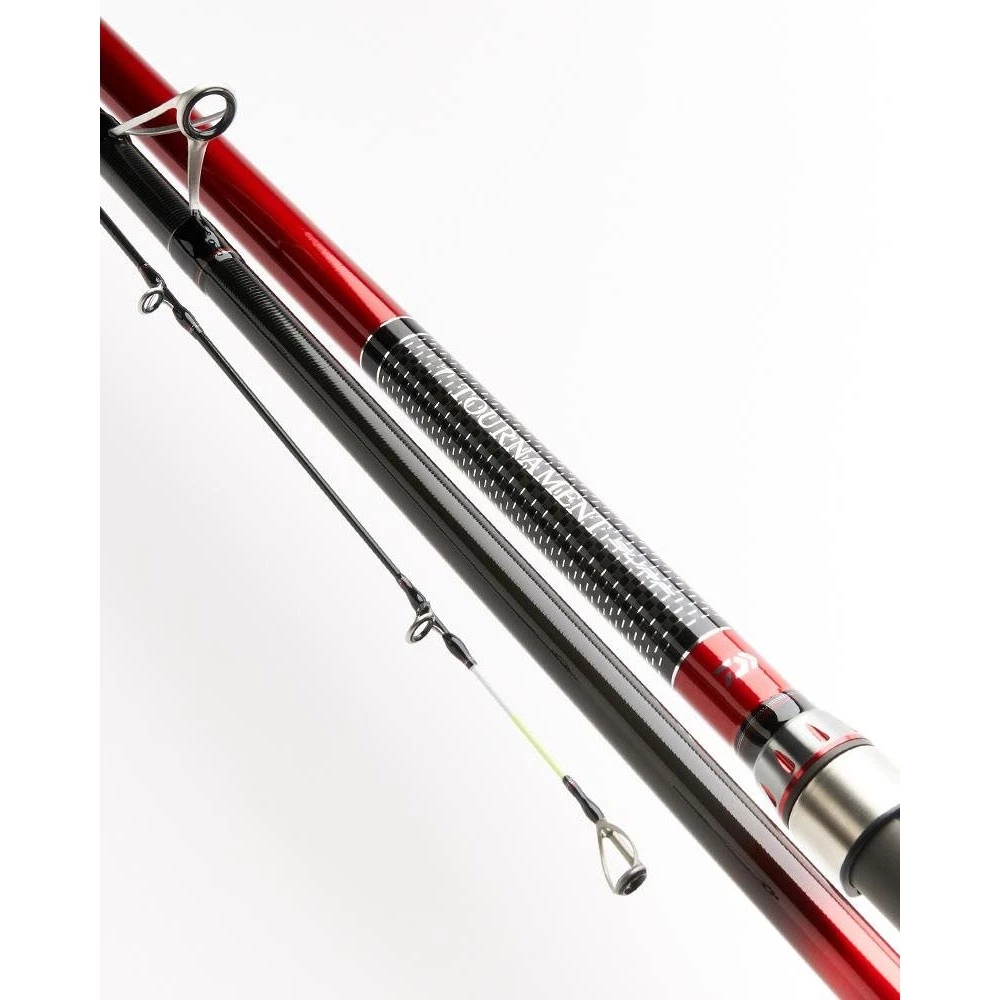 Daiwa Tournament Surf Rod – 14/15ft – 3-6oz – Hybrid Tip. Hybrid tip design, HVF High Volume Fibre carbon, V-Joint Bias carbon joints, X45 Carbon Technology, Full Japanese shrink grip and DPS style sliding reel seat on multiplier models, Fixed Fuji DPS reel seat on fixed spool and Bass rods, Stainless steel Fuji K Alconite guides, Supplied in semi hard travel case.