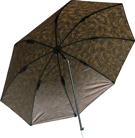 The Fox Camo Brolly features a central bar can be bent in Nubrolly style kinkickt so that the screen can be used with and without storm bars. The rod is simply unscrewed and then screwed back parallel to the back of the screen, in order to then put them in the ground so that it takes no place under the screen. Two storm pole adapters included for attaching Storm Poles (Storm poles not included).
