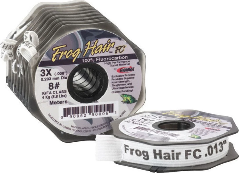 Unlike other fluorocarbon monofilaments that are very rigid and stiff, Frog Hair fluorocarbon is precessed to increase the flexability of the material and provide up to two times the suppleness of other typical fluorocarbon monofilaments.