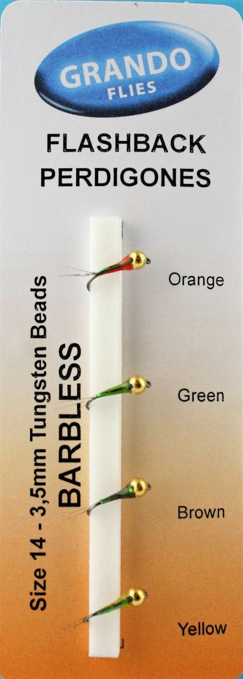 The Tungsten Bead Flashback Perdigones Flies from Grando Flies is a selection of 4 different coloured Flashback Perdigones: Orange, Green, Brown and Yellow. These flies are excellent for rivers, streams and of course, Stillwater venues.