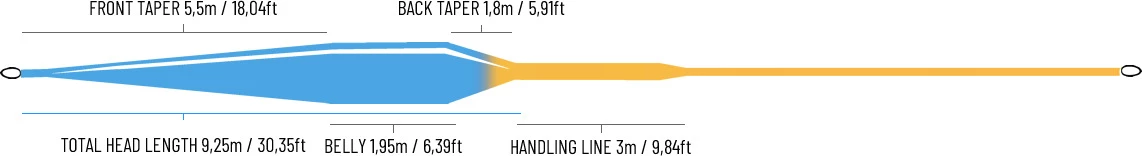 Your choice for Streamer, Sea Trout or Salmon fishing with singlehanded rods. It is virtually unaffected by wind and larger flies, shoots like a bullet, has a great balance and despite the short head it doesn’t collapse during flight. The taper-design reduces any disturbance in the loop and sends the line flying with a minimum of false casts. A 9,25 m long head and a 3,0 meter long, level handling line behind the back taper make the line forgiving and versatile. It will cast far with good control and little effort. Spey casting properties are excellent and the line is super effective when fishing in tight and overgrown rivers. It is also popular in lake or coast situations where room for back cast is a bit restricted.