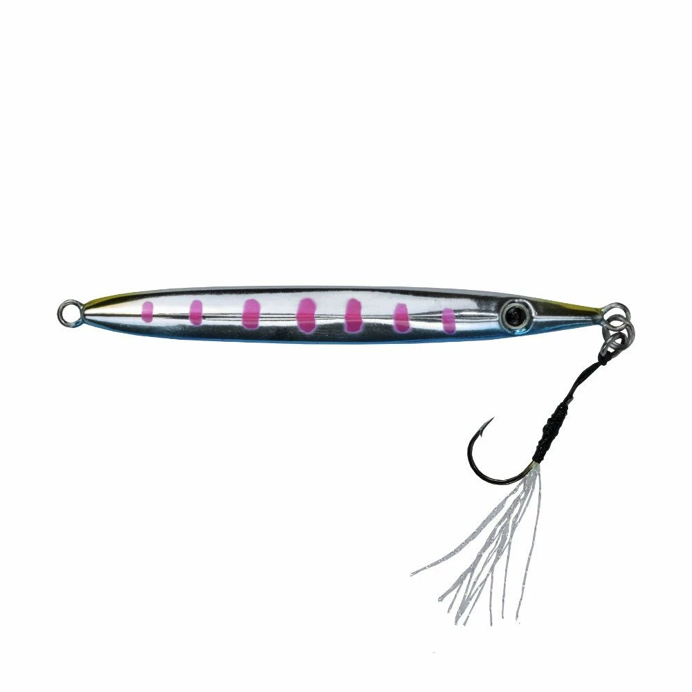 Surf jig designed to imitate baitfish such as sand eels. Designed with an asymmetrical body to provide the unique “flip flop” action. Create for targeting fish that will be in and around the surf such as bass, due to the water being stirred up the bright colours and UV blast finish have been added to improve attraction.