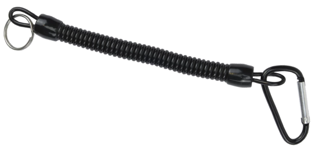 waistcoats. It comes with a small carabiner that can be attached to D Rings, webbing straps, belt loops etc. The stretch cord allows you to keep the items close to you until you need them, when you need them the cord stretches to where you require the items, still secure to its tether so if you drop them, you won’t lose your precious tackle. It comes with a large split ring that will attach to most tools. It can also be used for attaching a net to a D ring too.