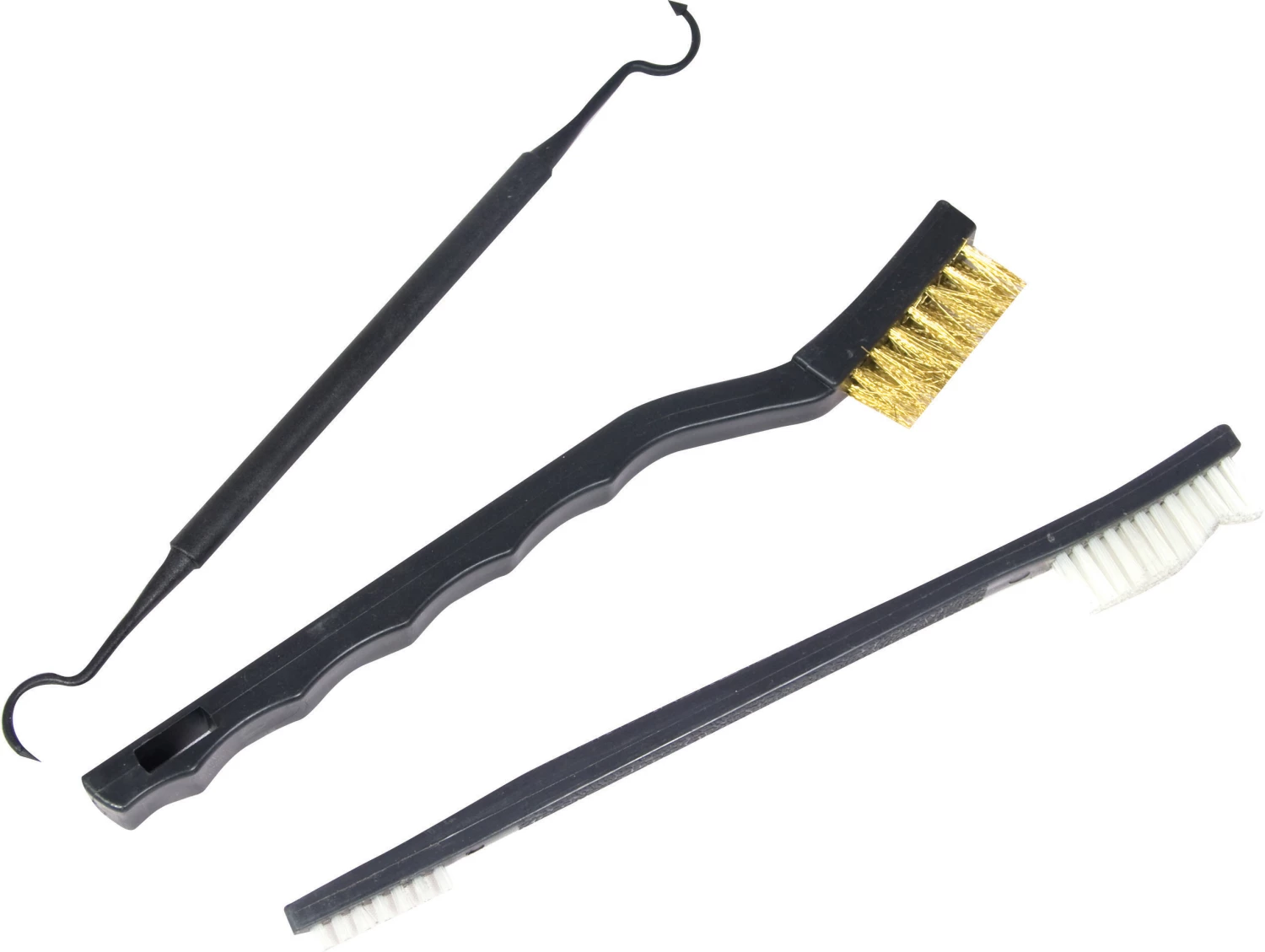 Handy little 3 piece brush set for caring for your firearm. Includes a bronze brush, soft bristle brush and a plastic pick.