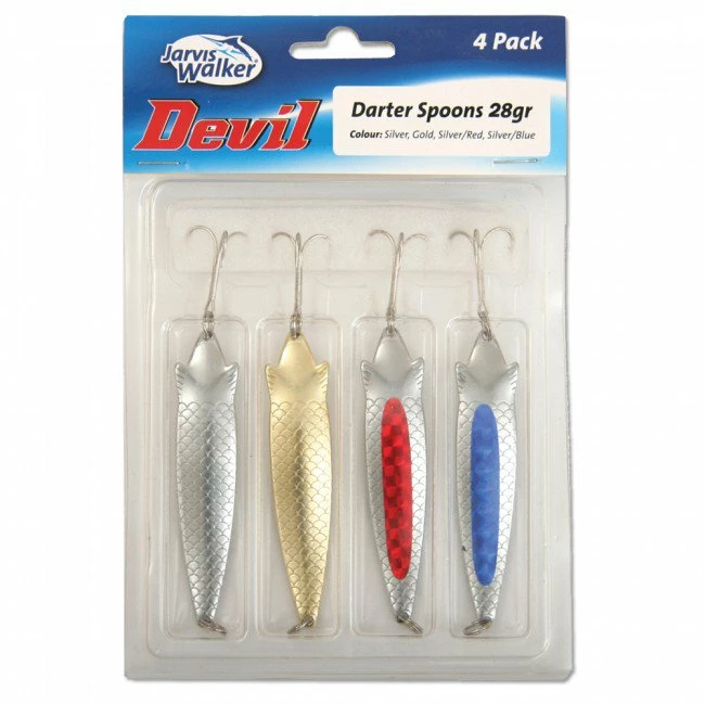 High quality spoon type lures from Jarvis Walker. 4 lures per pack, available as a mixed pack (as pictured) or all-silver. Available in a choice of sizes.