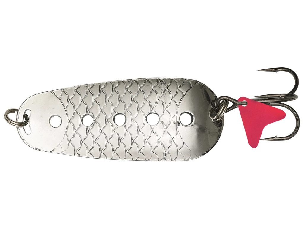 The Kinetic Spoony has an erratic action that mimics a fleeing baitfish – delivers underwater vibrations and attention-grabbing flashes. The small holes create subtle vibrations, enticing fish to strike. Works great for big predators like Pike and Salmon.