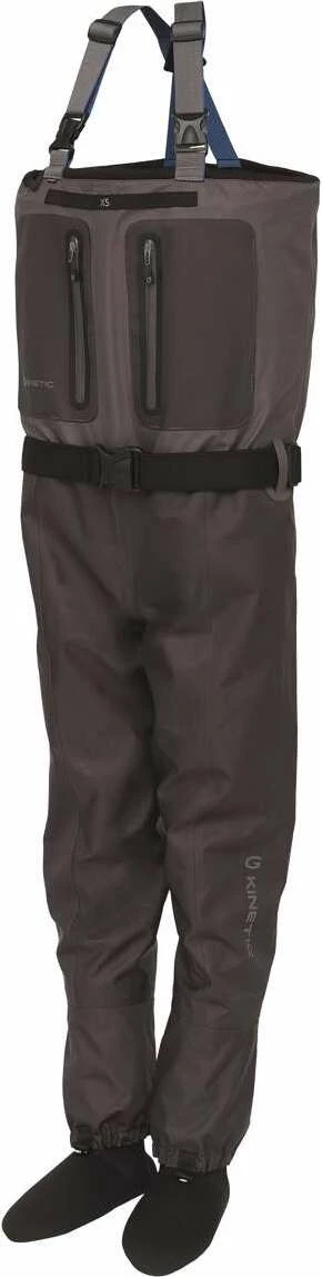 Kinetic X5 stocking foot waders are built to keep you dry and comfortable all day on the water. These waders are extremely breathable, and made of 5 layers of waterproof polyester in combination with PROxTEX membrane. Taped, glued and stitched seams prevent water from seeping in. The 5-layer body is great for walking through brush and kneeling on the bank. Attached gravel guards keep debris out of your boots. Fully adjustable suspenders and an included wading belt provide a custom fit. Taped neoprene feet.