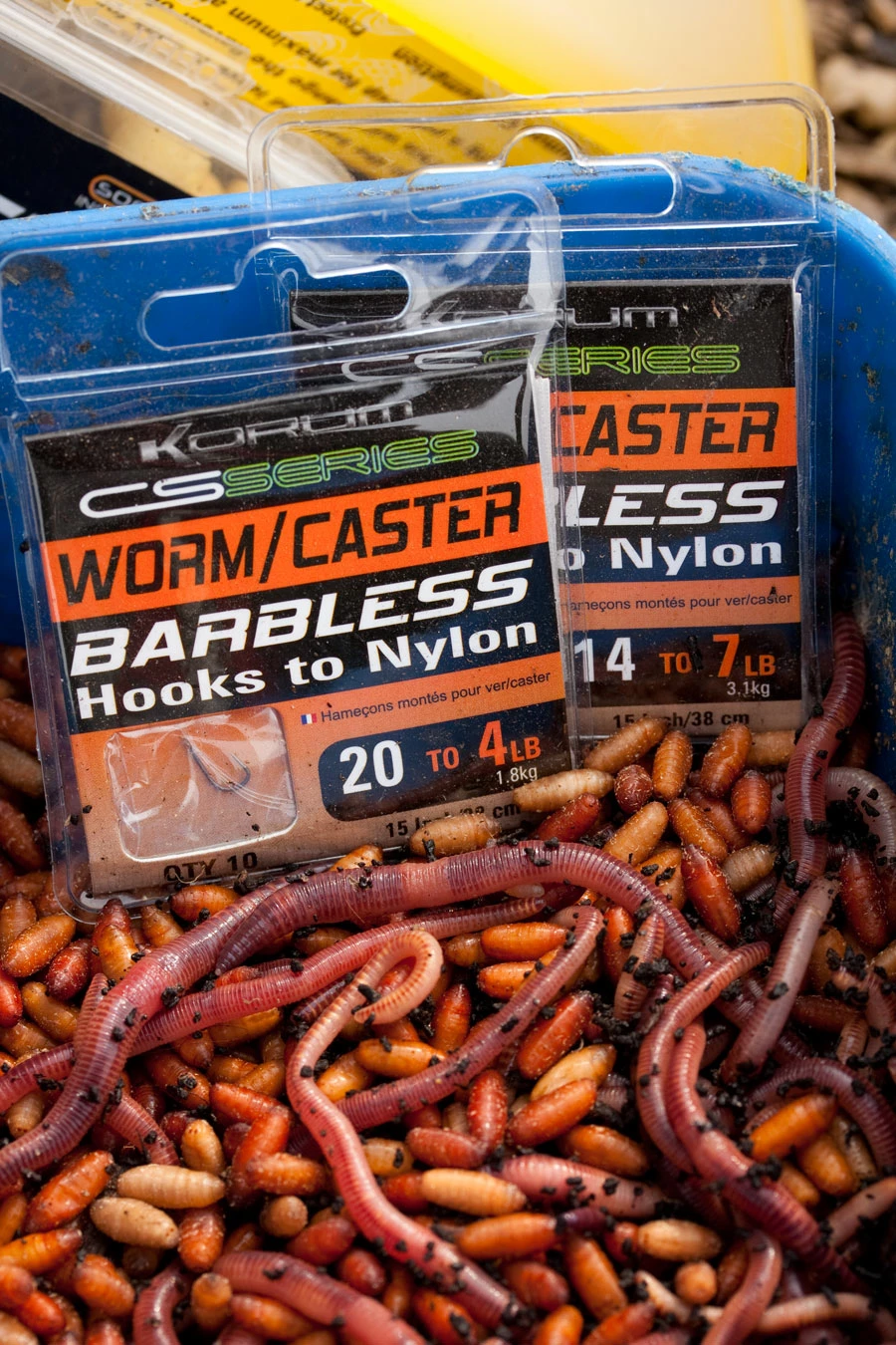 Korum’s CS Barbless Worm/Caster Hooks have been designed as part of the CS Hooks to Nylon range, a bespoke range of barbless rigs, purpose built for use with different baits. They are the perfect rigs for today’s commercial fisheries, whether you are feeder fishing, float fishing, or even for bomb work. Korum picked the brains of some of the countries top match anglers to deliver a great range of rigs to get you fishing fast.