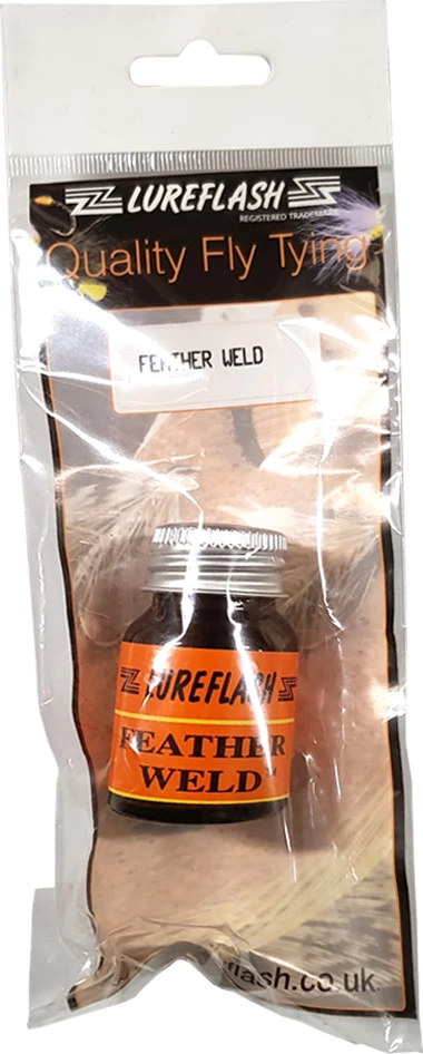 Lureflash Feather Weld is a clear flexible lacquer for repairing splits in feathers such as Jungle cock, without marking when folded for patterns such as roof wing sedges, or keeping wings together on standard wets and dry flies.