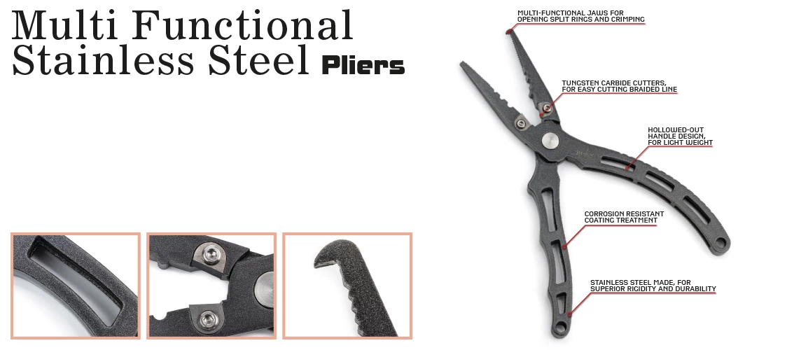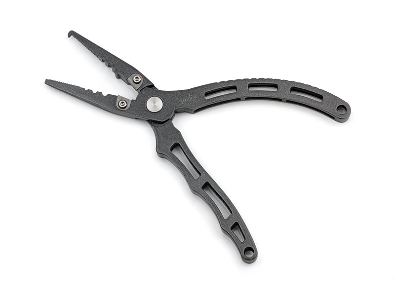 Pliers made entirely of stainless steel to increase its strength and resistance. Furthermore the anti-corrosion treatment preserves its characteristics during the years. The small “beak” on one of the two clamps allows the angler to easily open the split rings without much efforts. The ergonomic and lightened handle ensures an easy and solid grip. The special cutter blades, made of tungsten carbide, allow you to cut braided line and fluorocarbon easily.