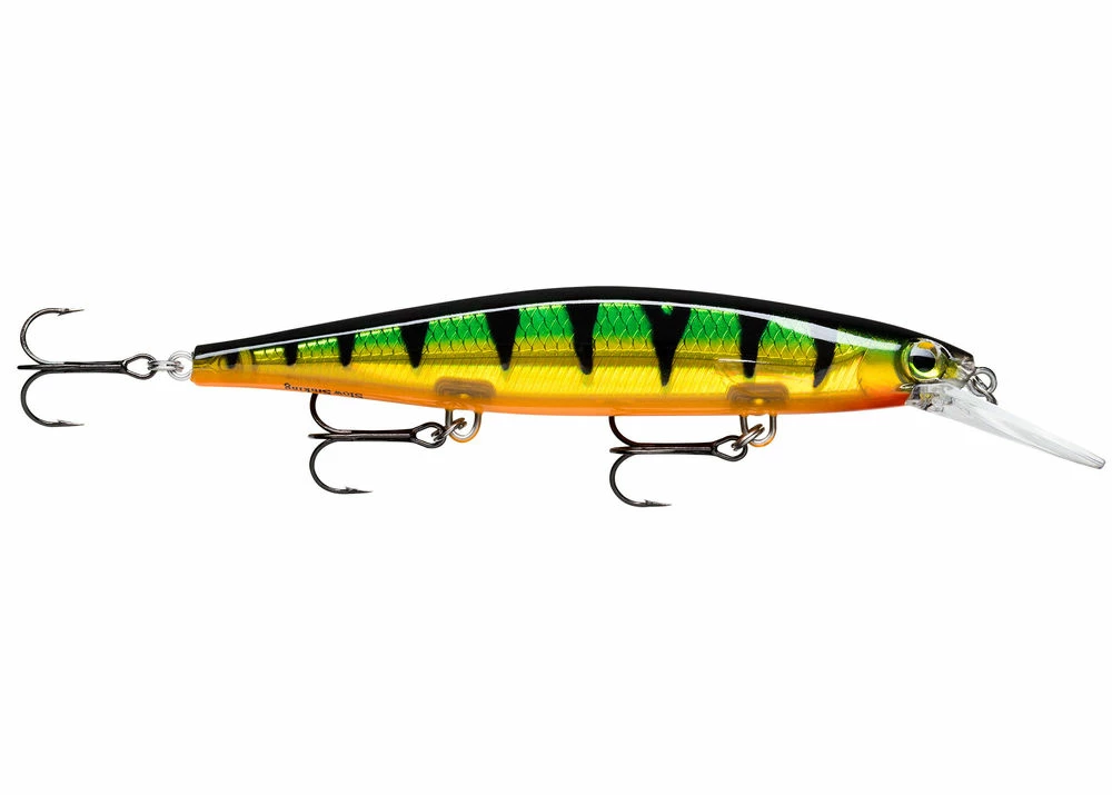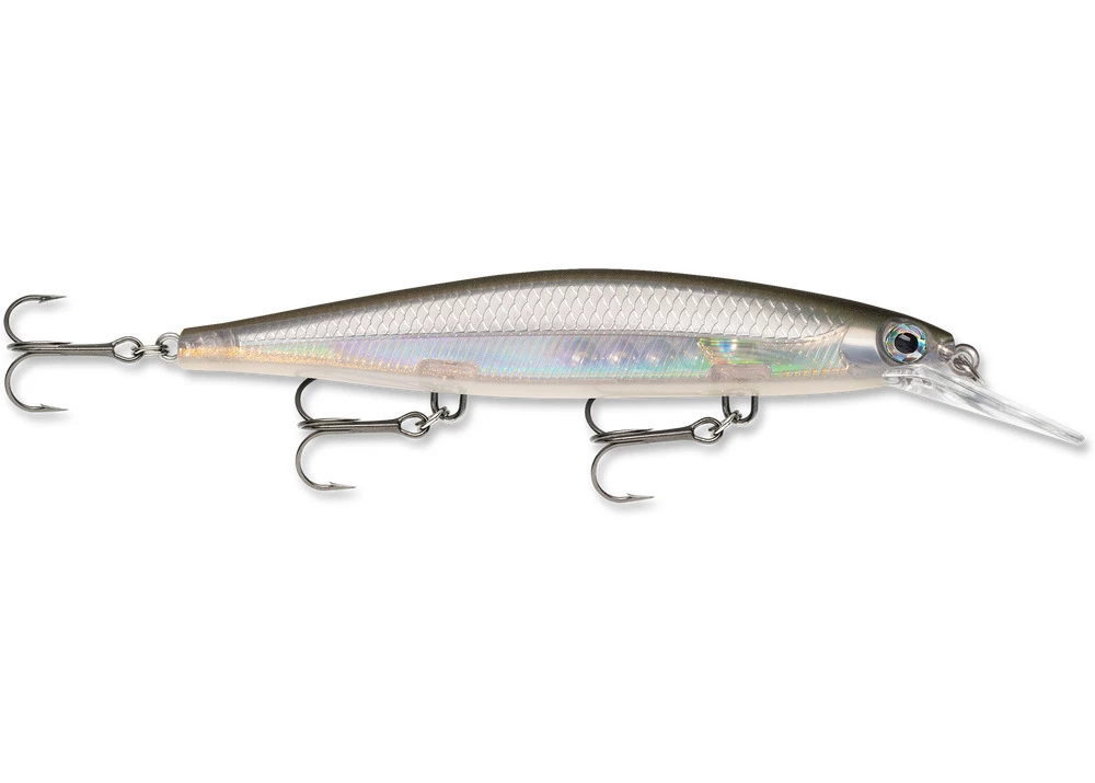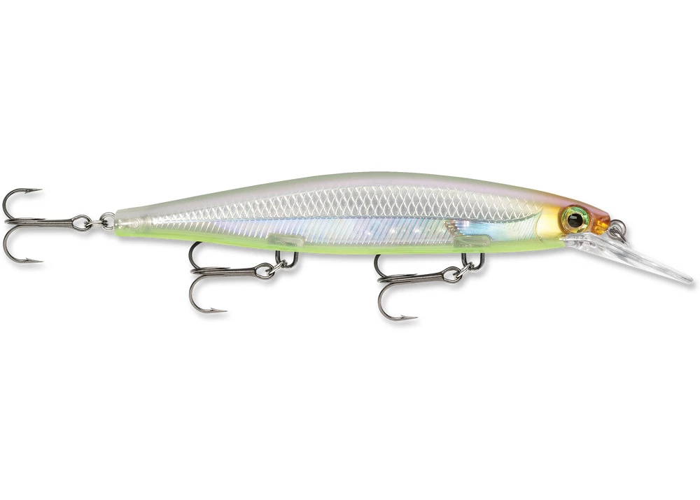 The Shadow Rap® Deep combines a horizontal struggle with a vertical fade that perfectly mimics a minnow in trouble in the 4-8 foot depth range. Rapala has perfected the natural minnow action in this new jerkbait that triggers fish in three ways: on the kick, on a slow fading fall and on the snap back to life. Most jerk baits continue on a forward plane with each jerk. Not the Shadow Rap® Deep. It kicks almost 180 degrees right then left, so it can be fished nearly in place with very little forward travel, keeping the flickering fade right in a fish’s strike zone.
