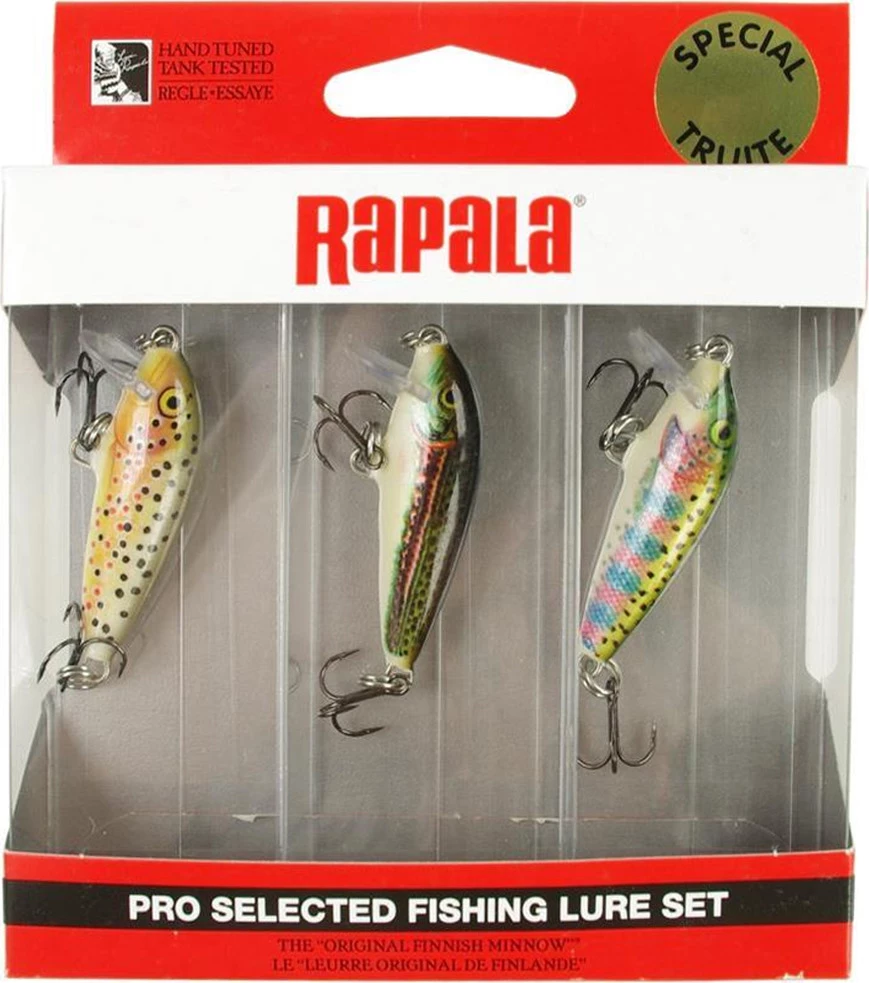 The Rapala Trout kit an excellent little kit which holds 3 crankbaits in trout catching colours. These packs consist of 3 crankbaits in colours: Minnow, Brown Trout and Rainbow Trout, ideal for Stillwater and river venues. Pro Selected fishing lures.