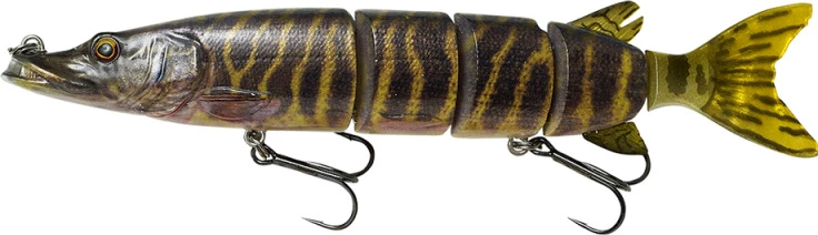 The lure swims with a super realistic slim S-Curve and will turn to the side on the spin stop, triggering strikes from following fish. It has a build-in rattle in the tail section, that will make a provoking click sound on the retrieve. Strong Pin-joints, ultra-sharp strong treble hooks and photoprint details. Great for casting and trolling for Big Pike and Musky.