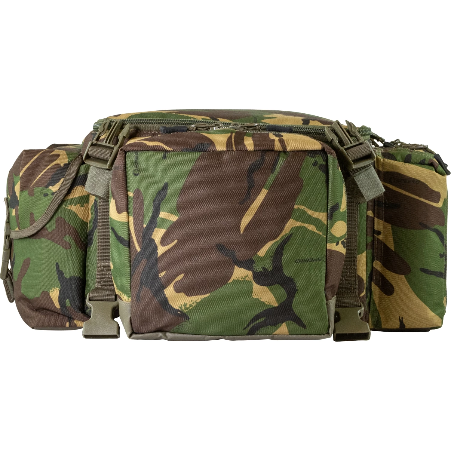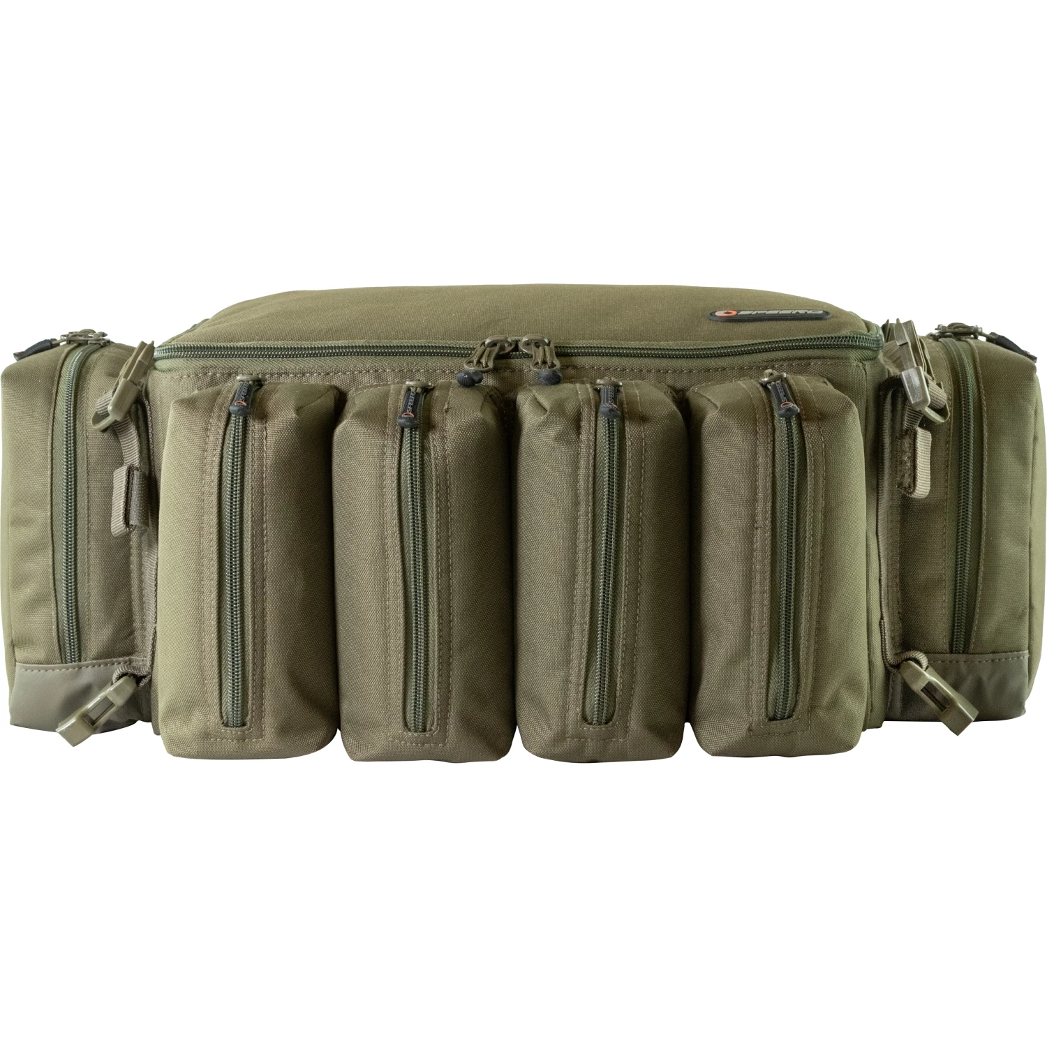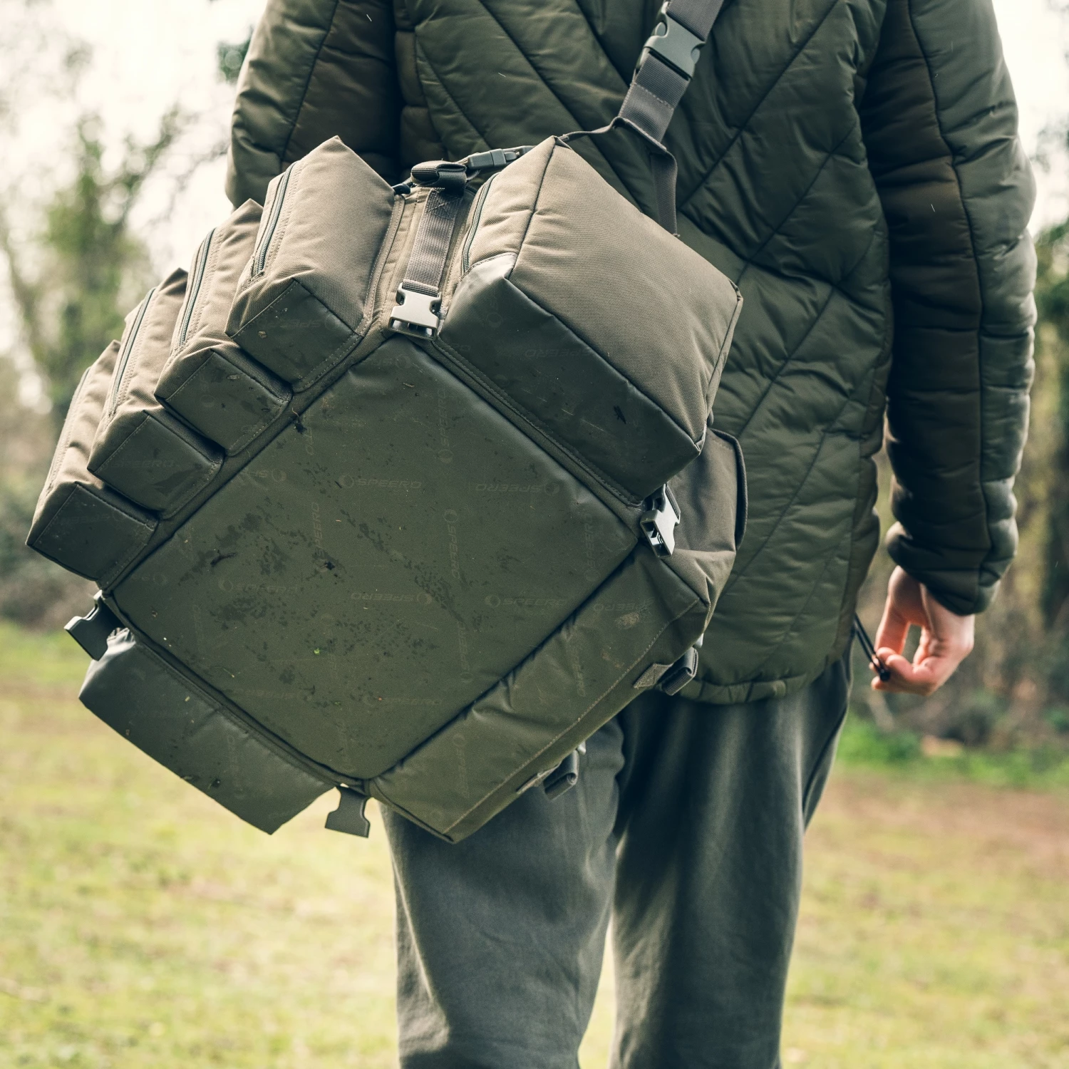 Designed around todays carp angler with various sized external pockets to take oils, glugs, stick mixes, sprays etc. and four front hook bait pockets taking up to 12 pots. The main compartment will take up to 12kg of bait or will accept the small and medium bait/cool bags enabling the angler to take different sizes and types of bait.