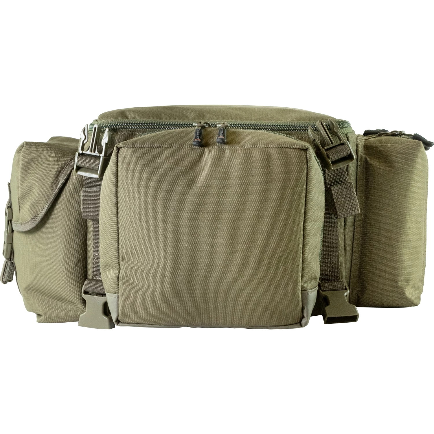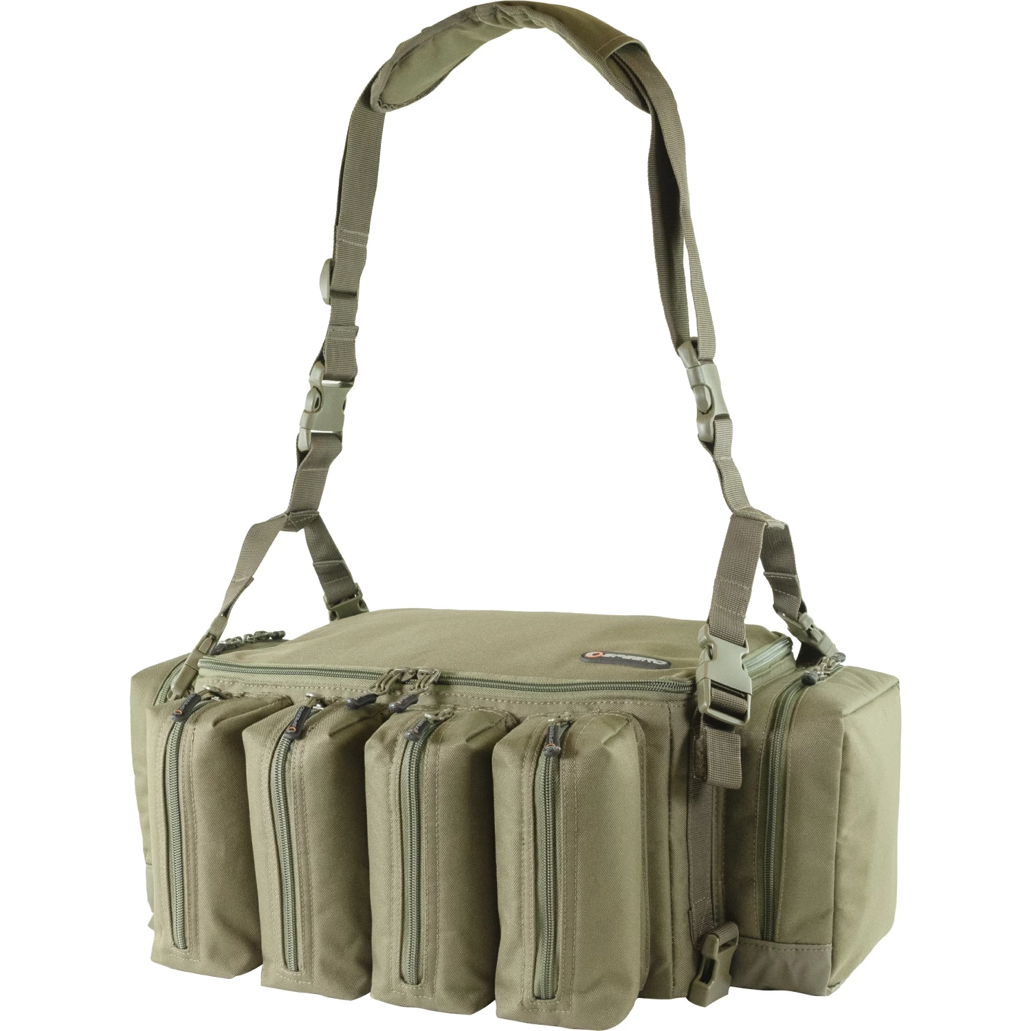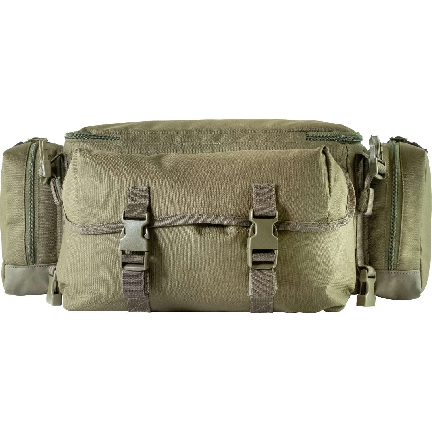 Designed around todays carp angler with various sized external pockets to take oils, glugs, stick mixes, sprays etc. and four front hook bait pockets taking up to 12 pots. The main compartment will take up to 12kg of bait or will accept the small and medium bait/cool bags enabling the angler to take different sizes and types of bait.