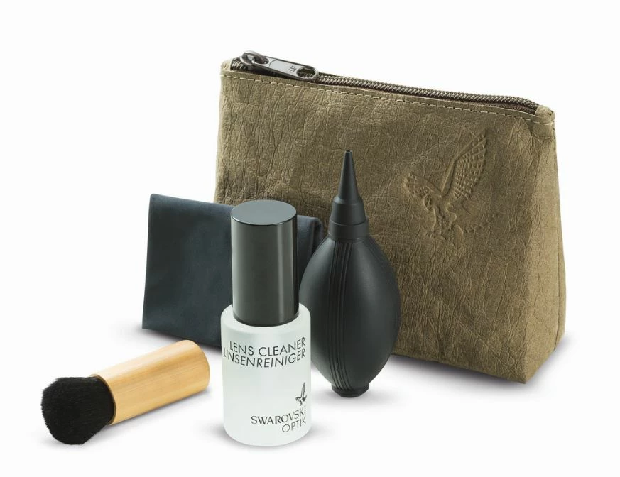 The CSO Cleaning set from Swarovski provides you with everything that you require to properly care for your optics. The Set contains a lens cleaner, cleaning brush, dust blower and two microfibre cloths in different sizes. All of this stored within a quality bag. The cloths and bag are suitable for machine washing (check label for washing instructions) and a reusable glass bottle has been chosen as part of Swarovski’s move away from plastics.