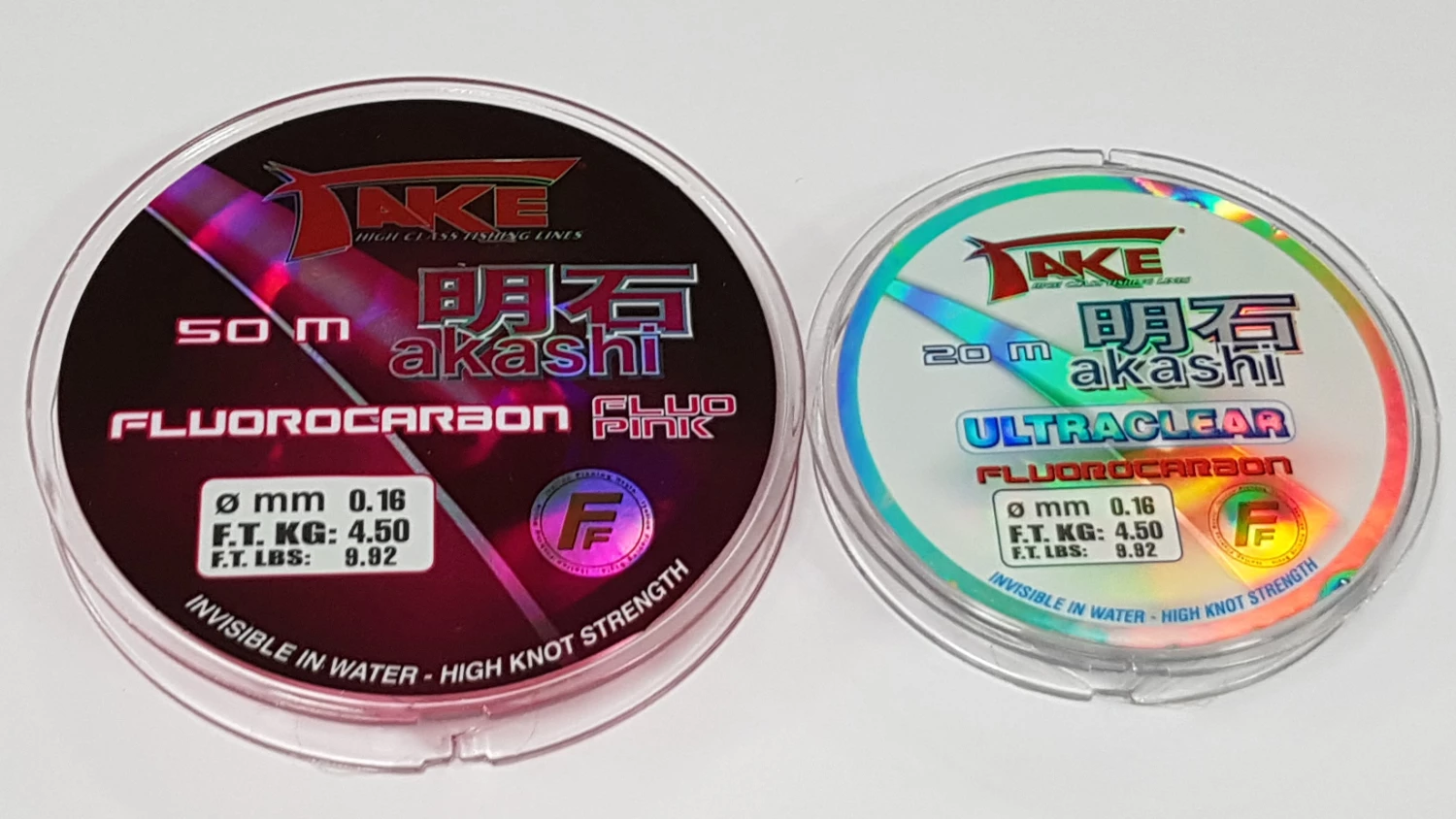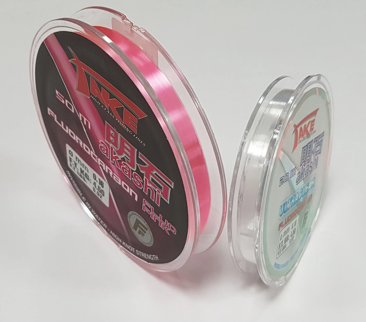 Akashi Fluorocarbon from Take is highly supple and features extremely low memory, aiding in perfect presentation every cast. Near invisible in the water, and featuring a high knot strength. This Double Spool series, combines the ultraclear and pink fluoro, has excellent quality.