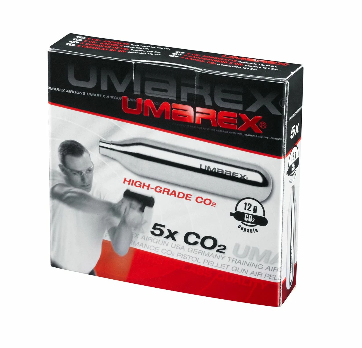 Umarex pack of 5 12g Co2 Capsules, filled with filtered gas to maximise performance and to decrease soiling of the air valve.